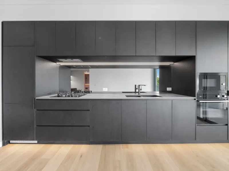 * Modern new kitchen with extra cabinets for storage