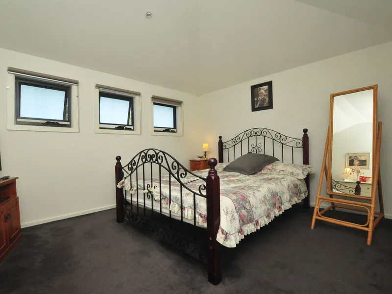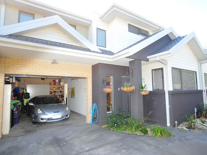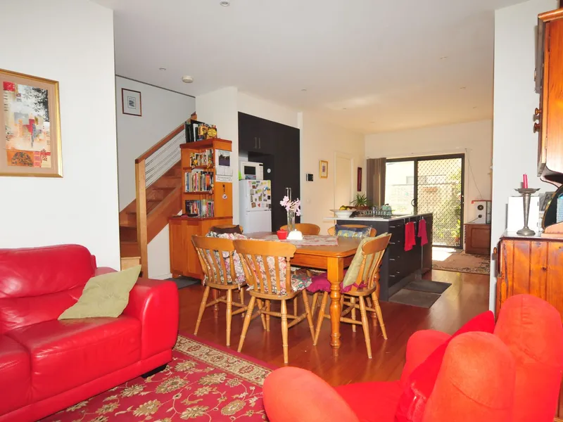 Apartment is 12 years old, 2-storey (bedrooms upstairs) on block of just four. Light and airy with courtyard. Garage is a generous width with room for one car, some storage possible. One bathroom, two toilets (upstairs, downstairs). Study niche upstairs.