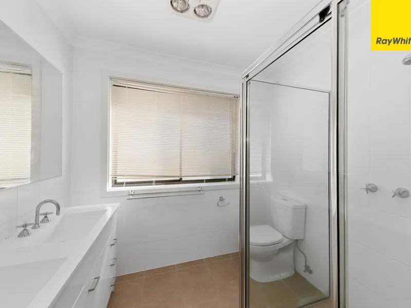 Carpeted stairs sweep you up to the top level, where the spacious main bedroom forms a parents' retreat with a walk-in robe and elegant ensuite with double vanity and is thoughtfully segregated from the 2 remaining bedrooms. The main family bathroom is light and bright with a separate shower and a bath for long soaks. A designated study nook at the top of the stairs is a welcome addition.