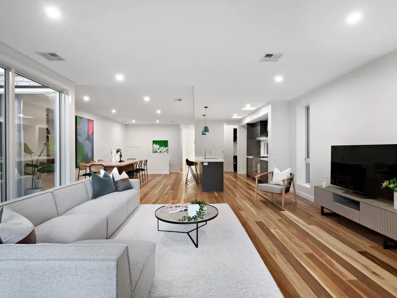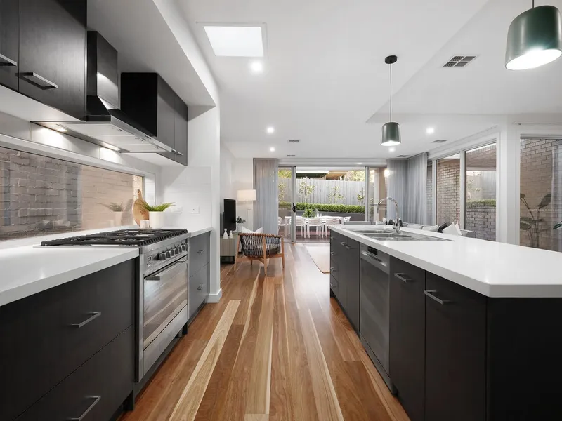 An ultra-modern townhouse in a location loaded with lifestyle benefits, suited to couples and young families. Within an elegant boutique complex, this stylish abode split over two levels is designed for maximum enjoyment and minimum upkeep. Downstairs this impressive home features a spacious open plan design; sleek kitchen featuring stone benchtops and Smeg stainless steel appliances overlooks the living-dining area plus a powder room. Upstairs are 3 bedrooms, main bathroom and a full ensuite to the master. An inviting private courtyard with paved alfresco area is perfect to enjoy a BBQ in the sunshine surrounded by low maintenance gardens.