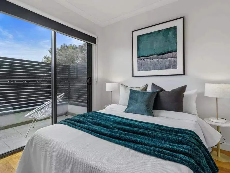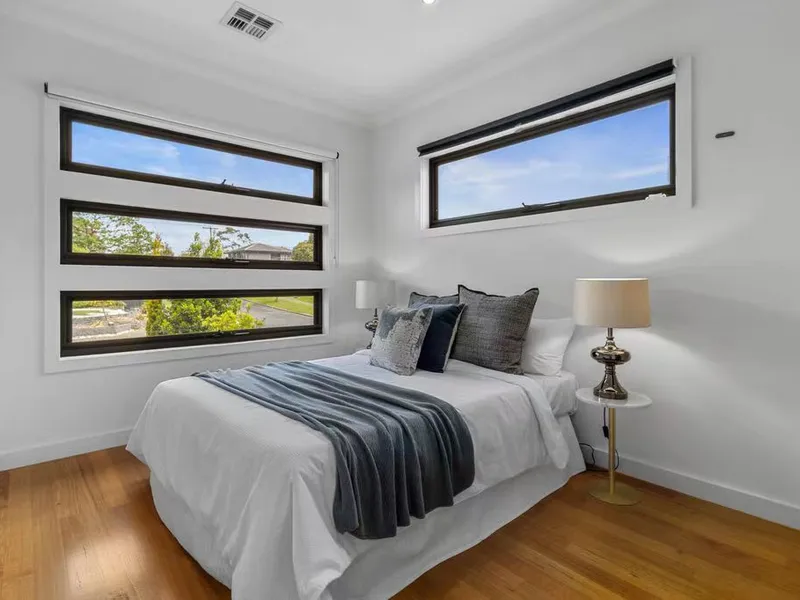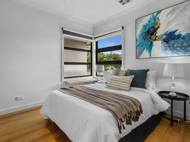 On the ground floor, one master bedroom is a tranquil haven with a walk-in robe and a stylish ensuite. Conveniently nearby is the laundry with rear access. Striking an impressive tone upon entry, the open plan living and dining domain is adorned with high ceilings, stylish floorboards, the kitchen boasts sleek Bosch stainless steel appliances, and a glass safety partition enhances the elevated dining zone's modern feel.