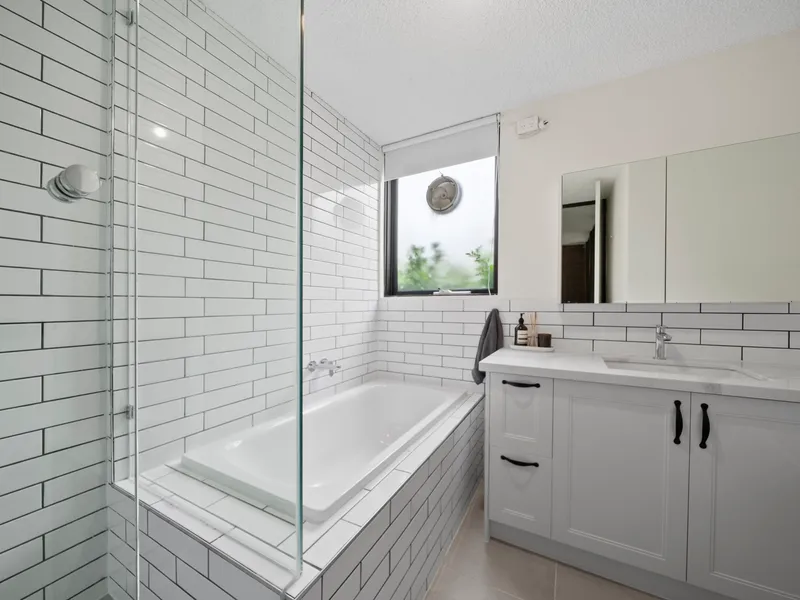 - Sleek modern central bathroom, frameless shower screen, bathtub, vanity with built-in basin stone bench top double mirror with storage