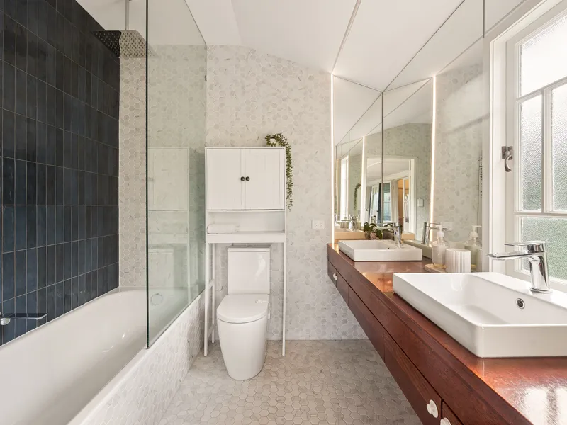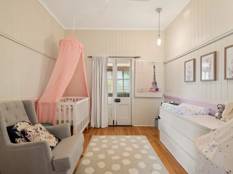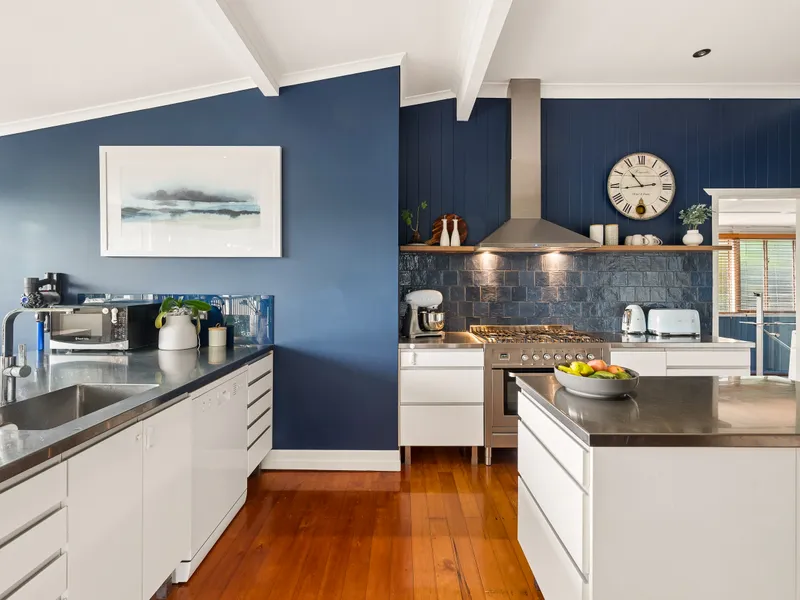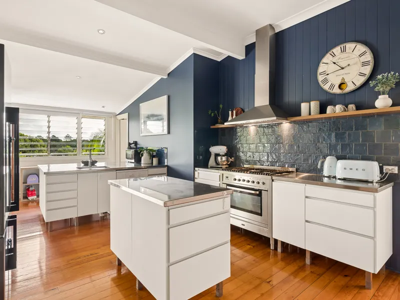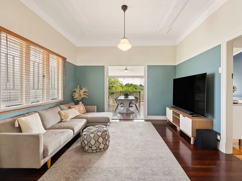 The postcard entry is delightful and leads to the light-filled living area showcasing polished timber floors and ornate ceilings with a large living, dining and kitchen area boasting elevated views from the rear deck!