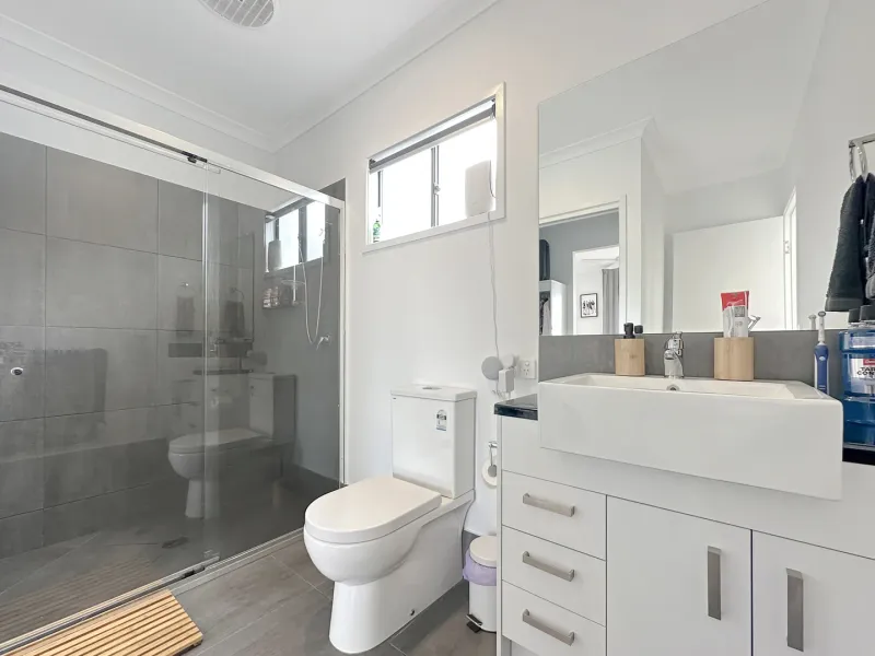 The ensuite is thoughtfully designed and includes a shower and toilet for added convenience.