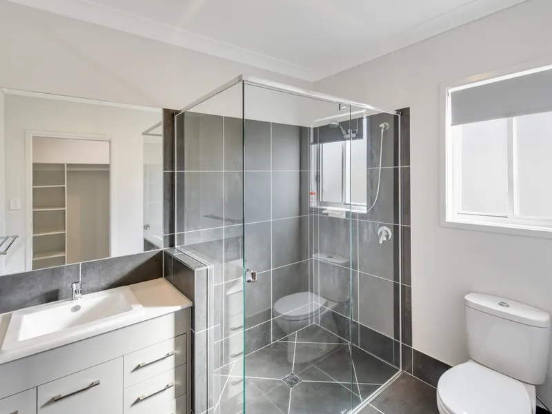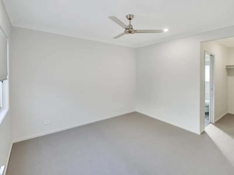 Just off the main living area is the spacious master bedroom, boasting a walk-in robe, en-suite, air conditioning, and a ceiling fan for year-round comfort.