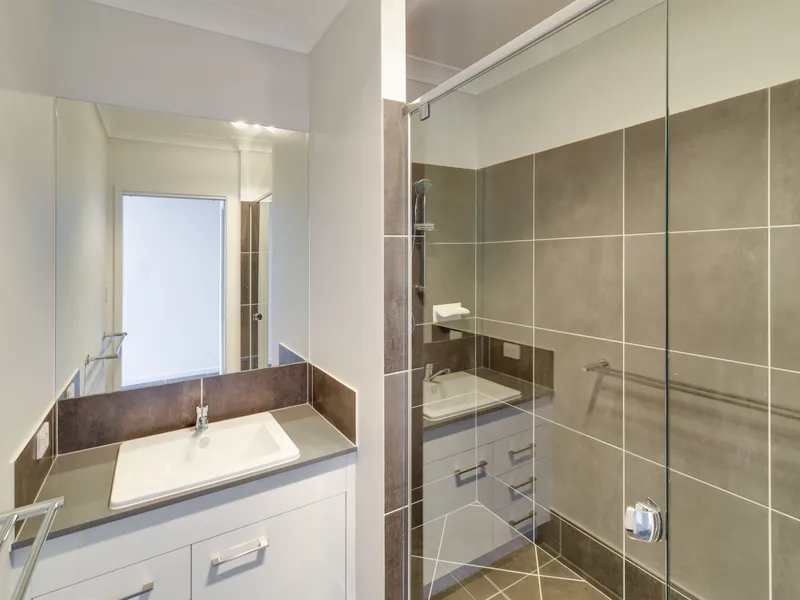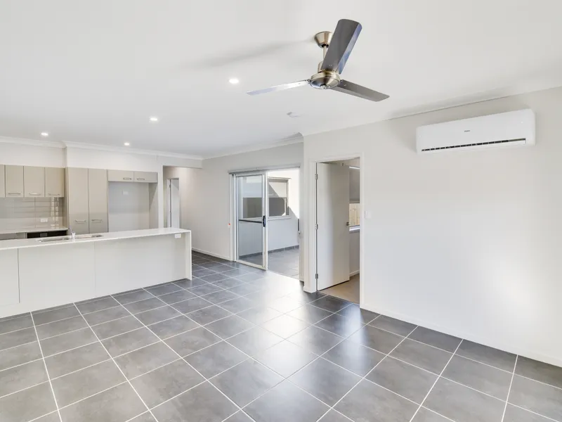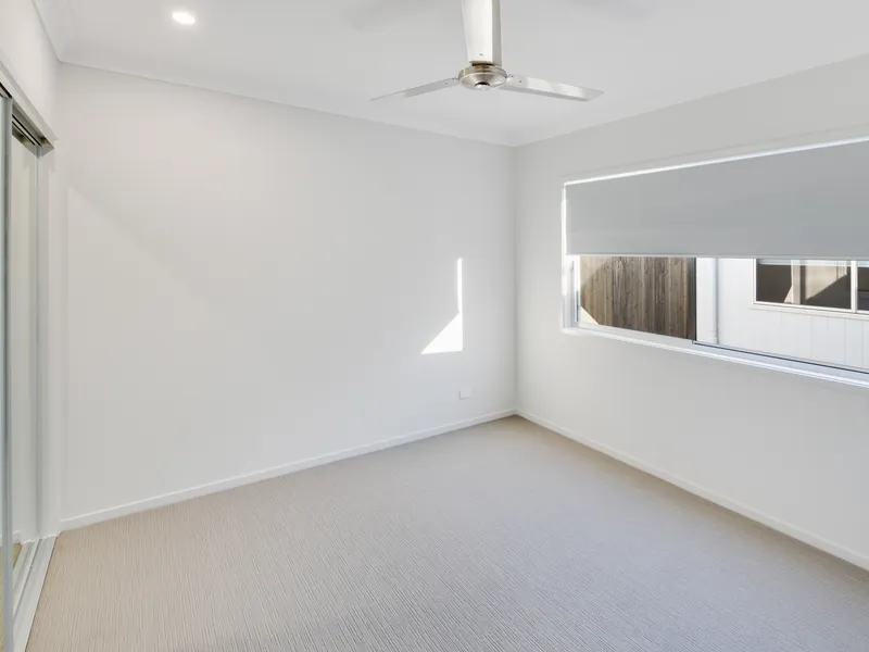 This well-designed three-bedroom townhome offers a functional layout perfect for comfortable living and entertaining. Two bedrooms, each featuring built-in wardrobes and ceiling fans, are thoughtfully positioned on either side of a stylish central bathroom for added privacy.
