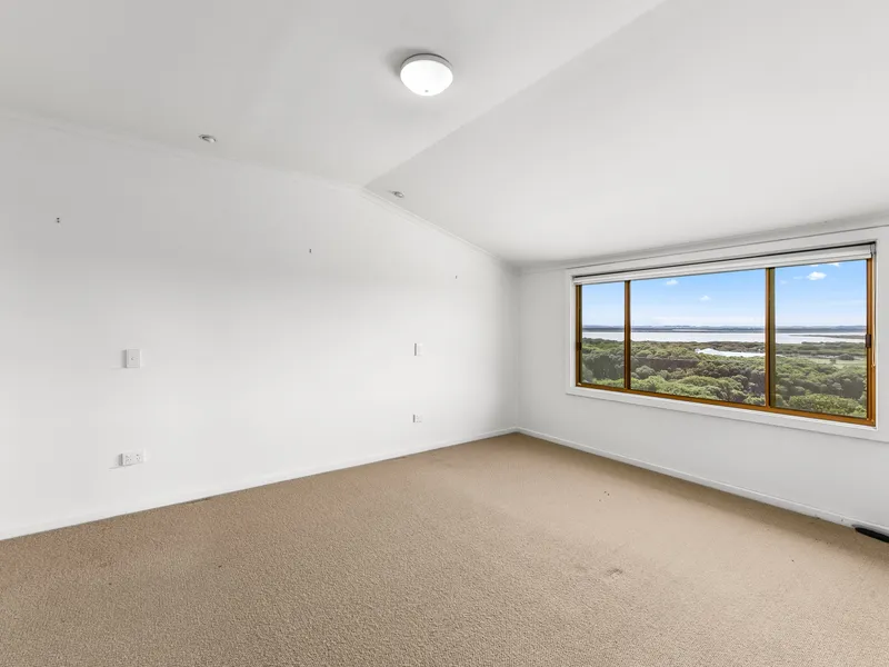 This beautifully designed home encompasses two stories, providing breathtaking views from every window. On the ground floor, you’ll find a tiled, open-plan kitchen, dining, and living area featuring a wall of windows that frames the expansive views over Lake George. The kitchen is fitted with generous storage options, including a spacious pantry, a dishwasher, and electric cooking facilities. The reverse cycle split system ensures year-round climate comfort throughout this large space.