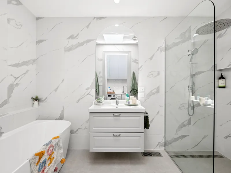- Floor-to-ceiling tiled bathroom with freestanding bath, walk-in shower and niche