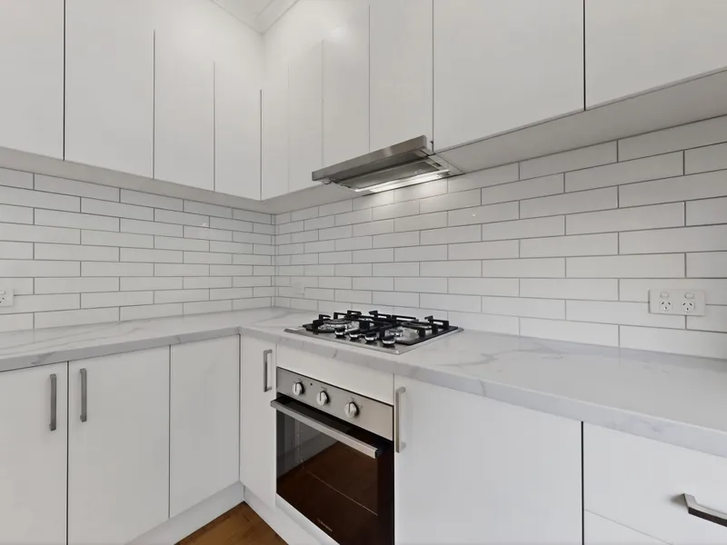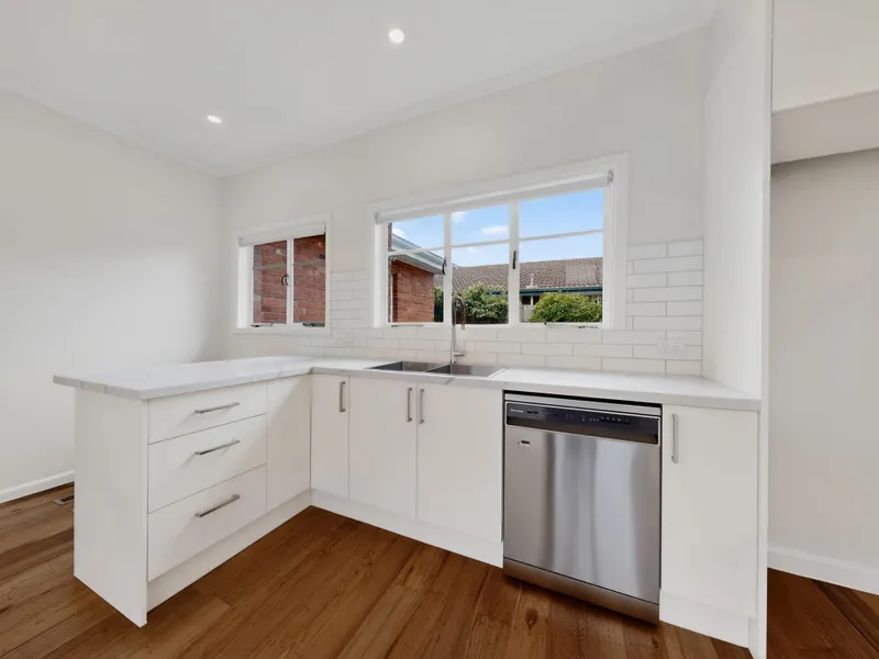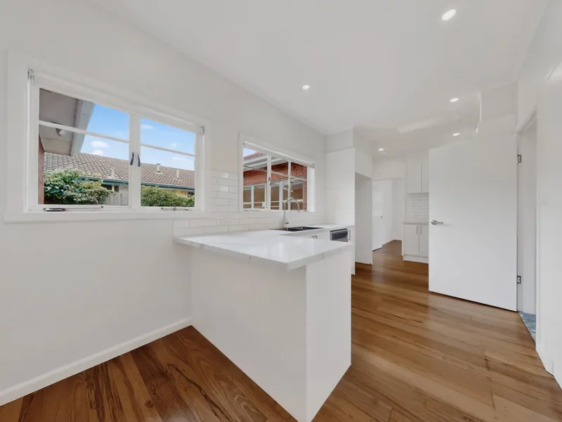 This light-filled home offers a spacious layout, featuring a large living area and a beautifully renovated kitchen complete with gas cooktop, stainless steel appliances, and ample cupboard and bench space.