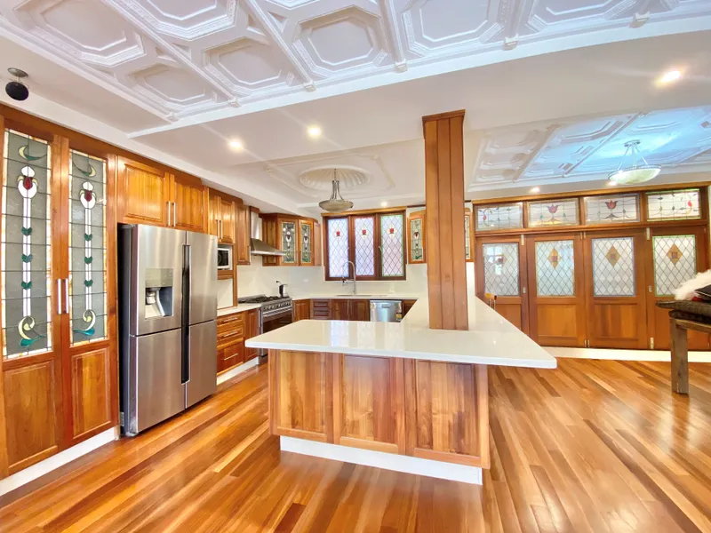 -Unique over-sized living area with timber flooring, decorative leadlight windows and geometric coffered ceiling.