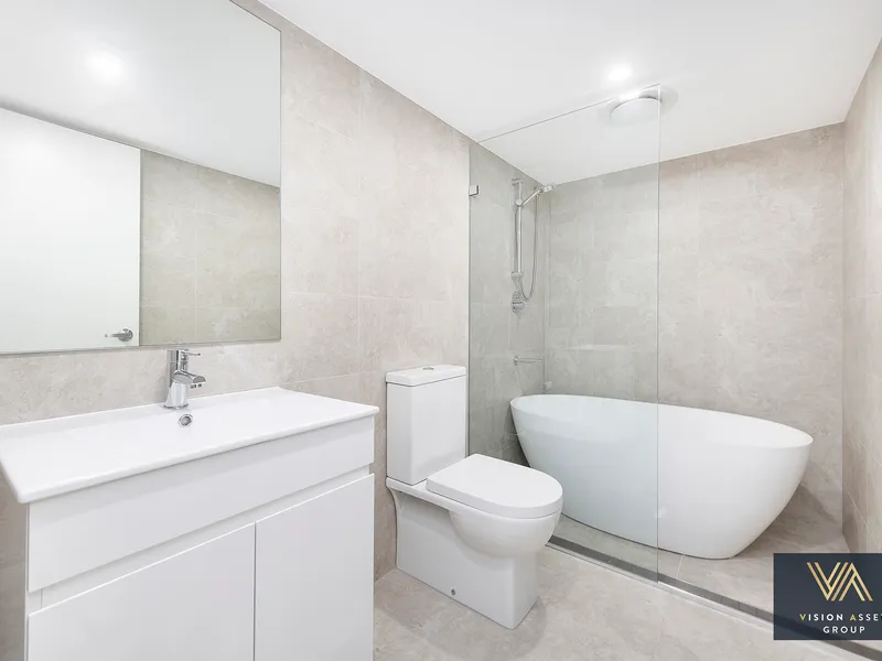 • Spacious and modern bathroom with frameless shower and Bathtub