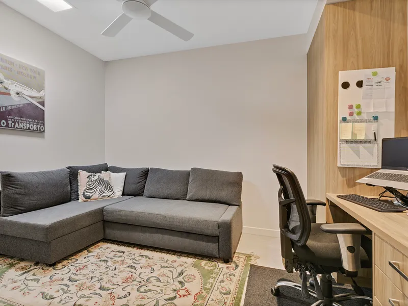 * The multi-purpose room with functional pull-down bed, built in wardrobe and shelving. This multipurpose room offers retractable doors for additional privacy making this a complete separate guest bedroom if needed.