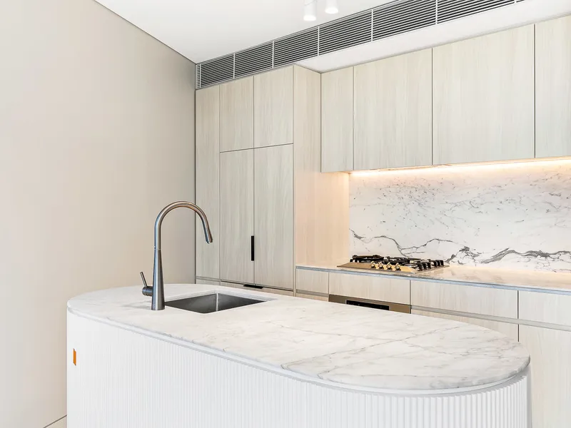 + Kitchen features' Statuario' marble island bench, benchtops and splashback with Miele appliances with integrated fridge/freezer