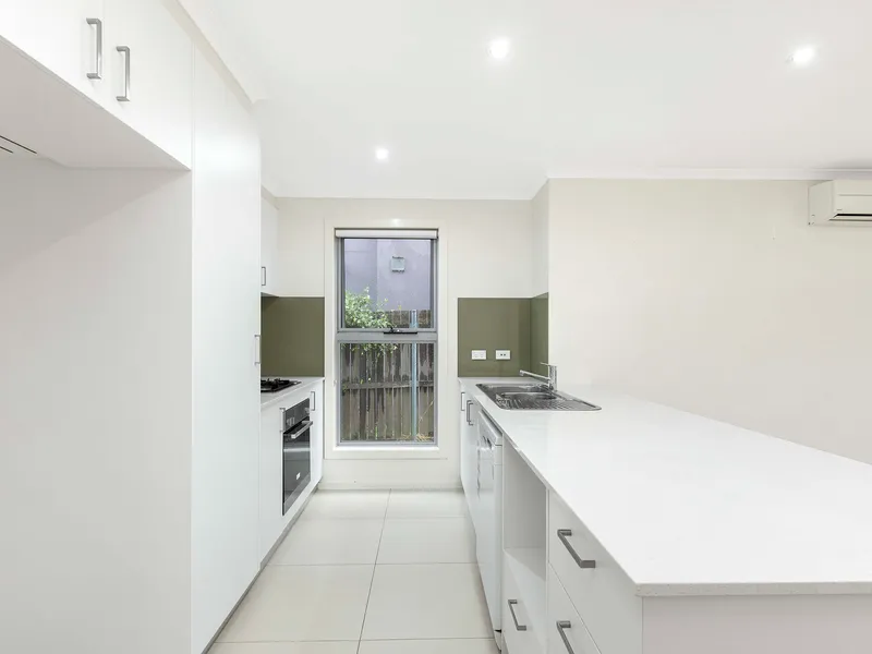 At the heart of the home is an open-plan living and kitchen area that provides a welcoming space for both relaxing and entertaining. The kitchen is sleek and functional, featuring a gas cooktop, oven and dishwasher, along with generous bench space and a breakfast bar ideal for casual meals or gathering with family and friends.