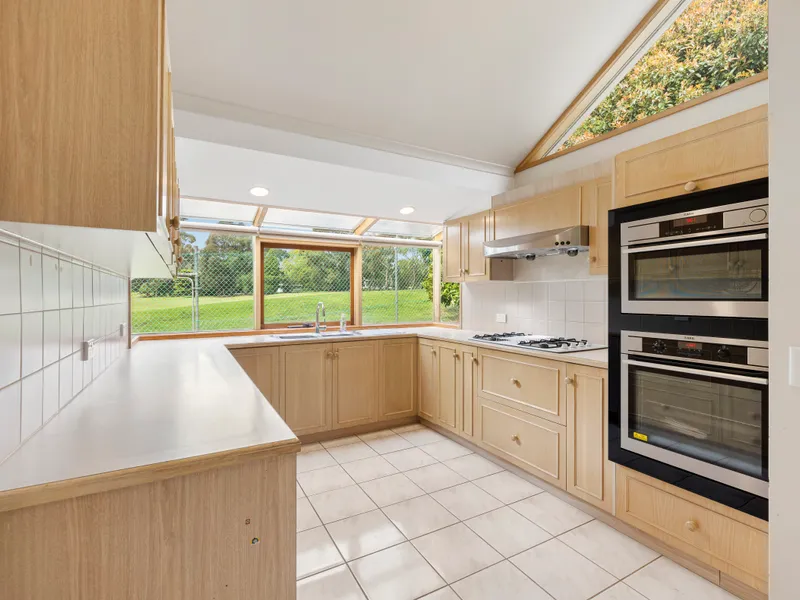 The kitchen and living area form the centre of the home, flowing seamlessly onto a deck and garden for easy indoor-outdoor living. The kitchen is equipped with a gas cooktop, oven, dishwasher, and a central island bench, providing ample space for cooking and casual dining.
