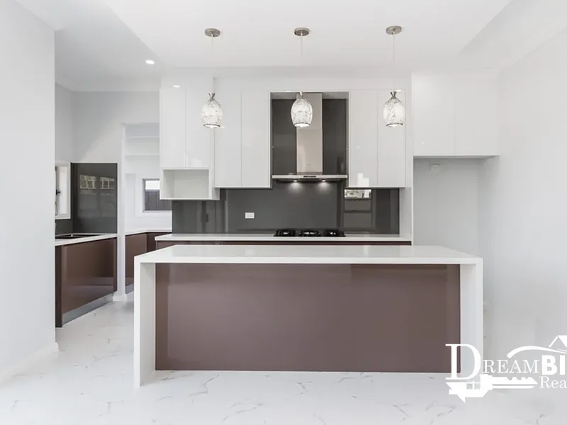 - Kitchen with gas cooktop, 900mm oven, dishwasher & stone benchtops