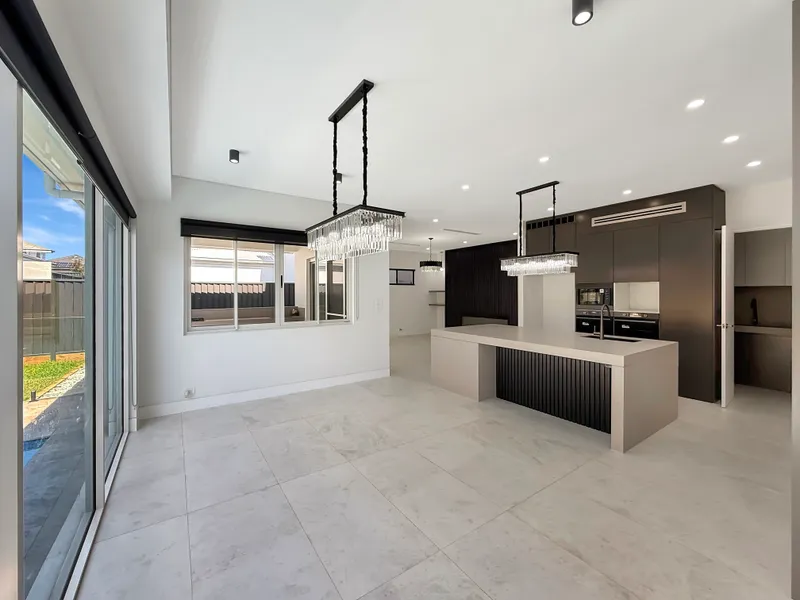 - Stunning kitchen offering stone benchtops, large functional island, feature lighting, integrated dishwasher, pantry, oven, & gas cooktop