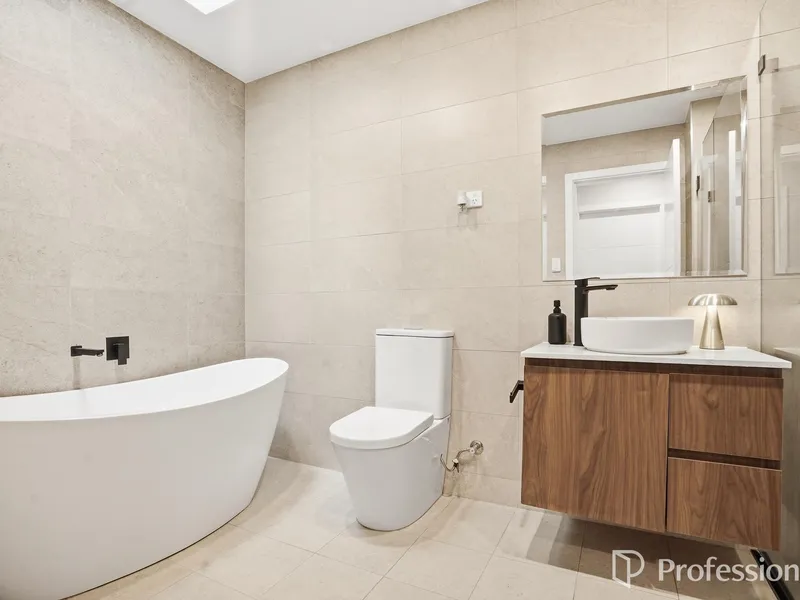 - Modern main bathroom with floor to ceiling tiles, skylight, floating vanity, and free standing bathtub