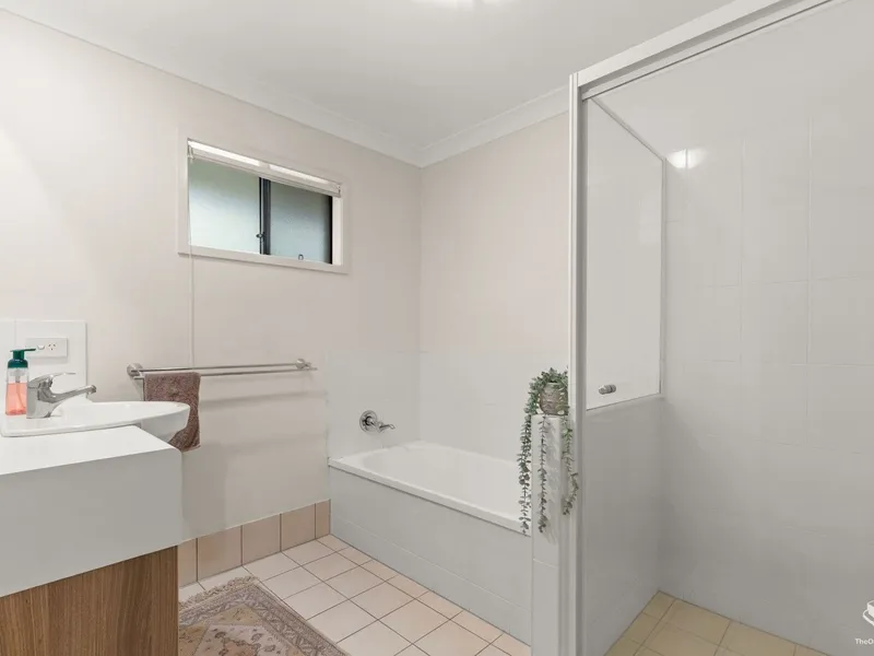 Large family bathroom with bathtub. Built-in robes with shelving in all bedrooms.