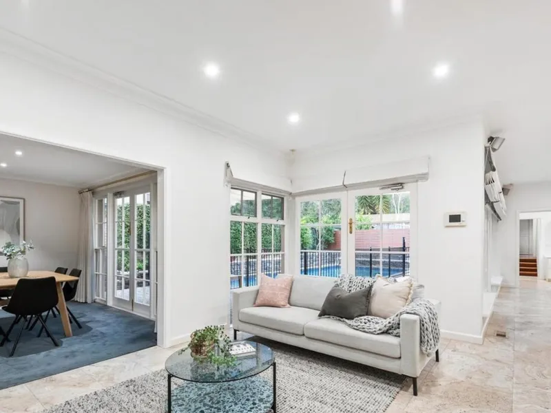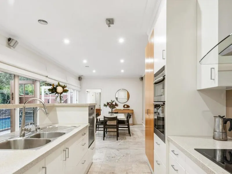 The home enjoys a wide entry foyer, double glass doors to the elegant lounge and lovely formal dining area; a granite kitchen centred around the north facing family and dining areas with its combination of Italian Travertine and parquetry floors. The spacious living areas open out onto the rear garden with a deck and paved alfresco pockets, with an inviting pool (maintenance included). The rear of the home is the parents’ domain with the bright main bedroom (built in robes), en-suite and fitted study, while a generous guest bedroom with built in robes and all-access en-suite, 2 further sizeable bedrooms with built in robes, a spacious bathroom, separate powder room and fitted laundry complete the home. Also an external studio, that’s perfect as a home office, gym or storage facility.