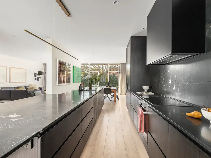 Enhanced by its location close to the Golden Mile beachfront at the end of Martin Street. Privately and securely positioned by a high rendered wall and northern landscaped garden preceding a single-level interior dominated by light and space. Featuring wide oak floors flowing to an expansive living and dining room with a floor-to-ceiling glass wall opening to a deck benefitting from winter sunshine. A sleek hostess kitchen and meals area is equipped with Quartzite stone bench tops, a long island bench plus prestige Miele, Bosch and Asko appliances.