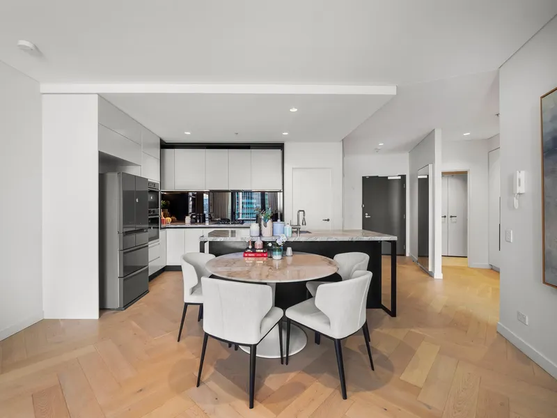 The spacious two-bedroom plus study layout includes a luxurious master retreat with walk-in robe, dual-vanity ensuite and balcony access. Herringbone timber flooring, soaring ceilings and abundant natural light enhance the open-plan living and dining area, seamlessly connecting to a private balcony. Retractable screens to windows and sliding doors invite natural cross-breezes, creating effortless indoor-outdoor comfort.
