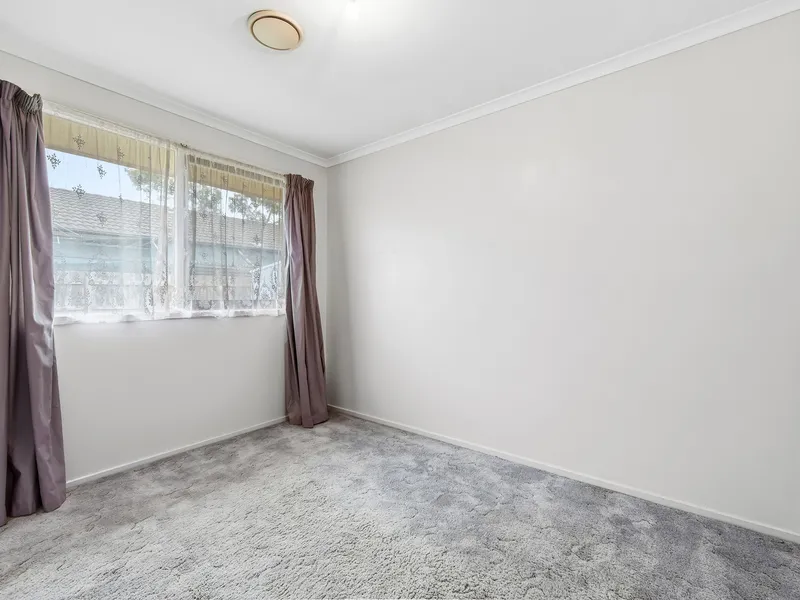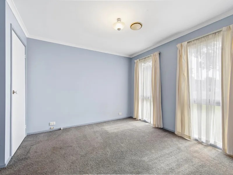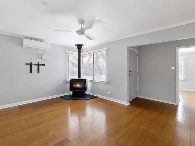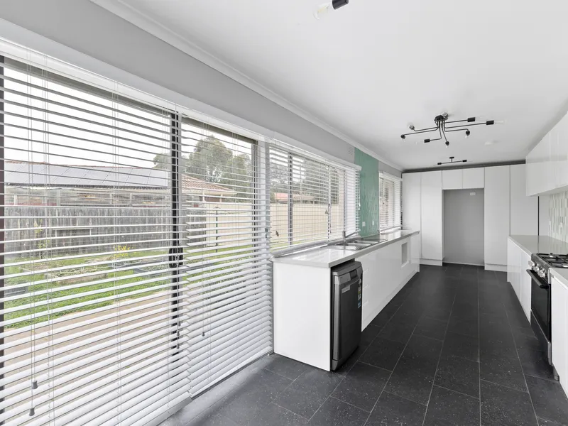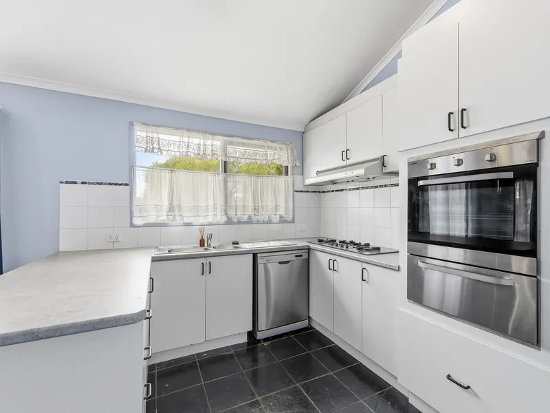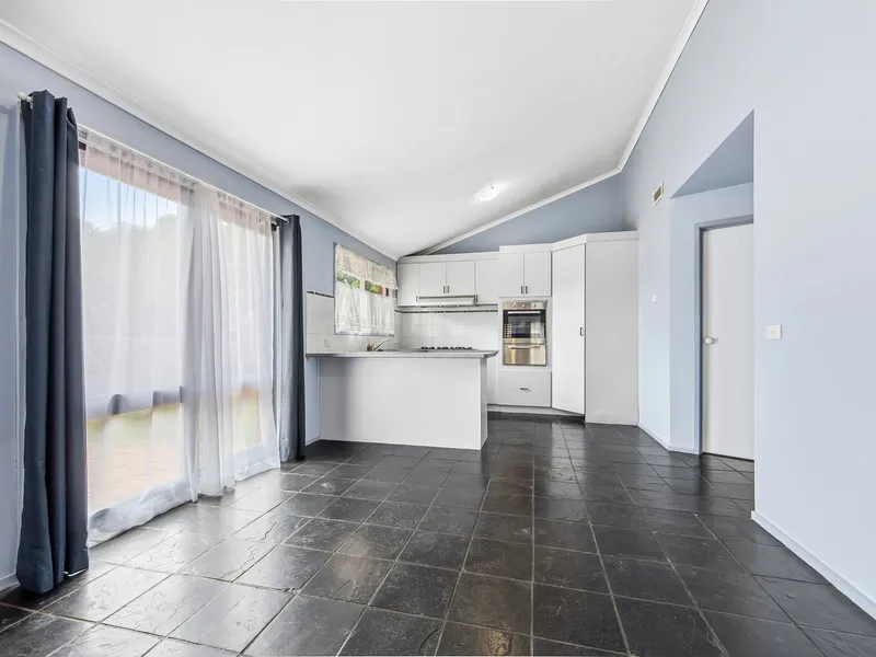 Inside, you'll find three well-sized bedrooms, each fitted with built-in wardrobes, serviced by a central bathroom. The home features a functional open plan layout with a spacious living and dining area, enhanced by high pitched ceilings that create a sense of openness and natural light throughout. The kitchen is equipped with gas appliances, ideal for everyday cooking, while a combination of tiles and carpet throughout ensures both comfort and easy maintenance.