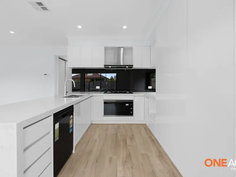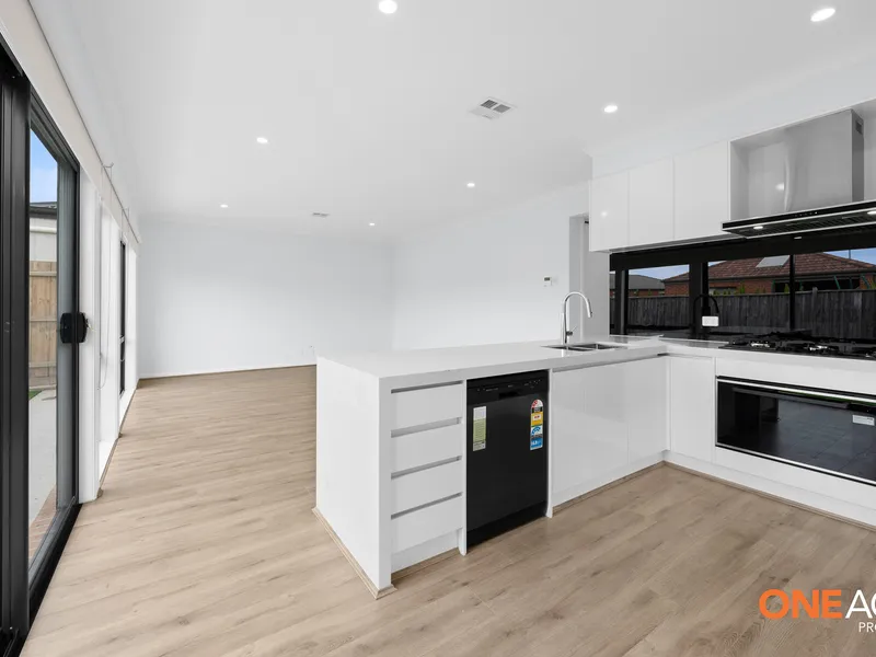 The home has high ceilings with high doors illuminated by LED downlights throughout, that seamlessly blend with the high ceilings to create an airy and inviting atmosphere. The modern kitchen is a chef's dream, showcasing a sleek stone bench-top, 900mm freestanding appliances, top-and-bottom cabinets.