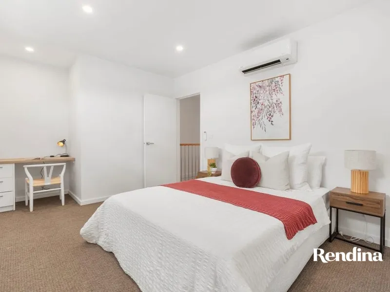 Featuring spacious and light filled open plan living and meals area with timber floors, 3 split system units, 2 well sized bedrooms, extra-large main with WIR, ensuite and upstairs study nook with built in desk and private balcony.