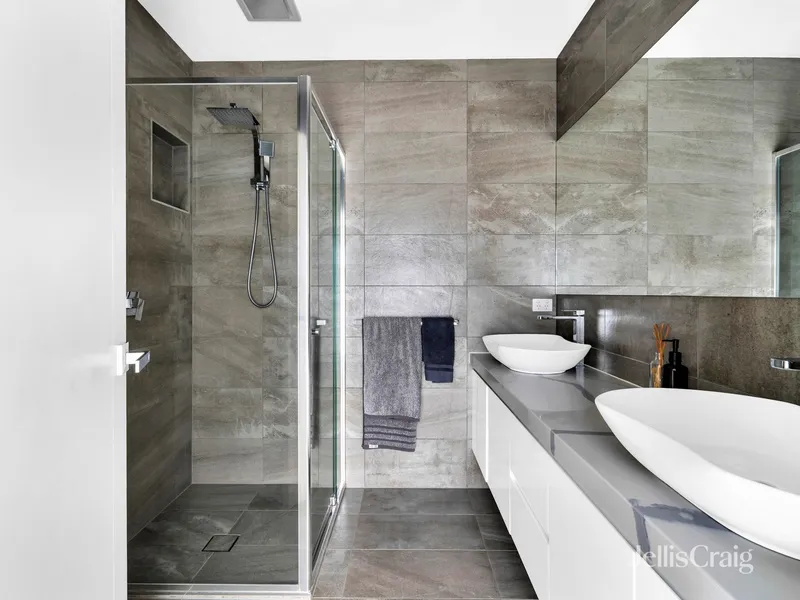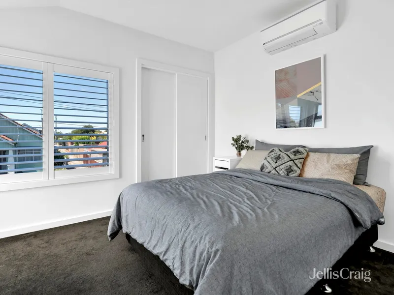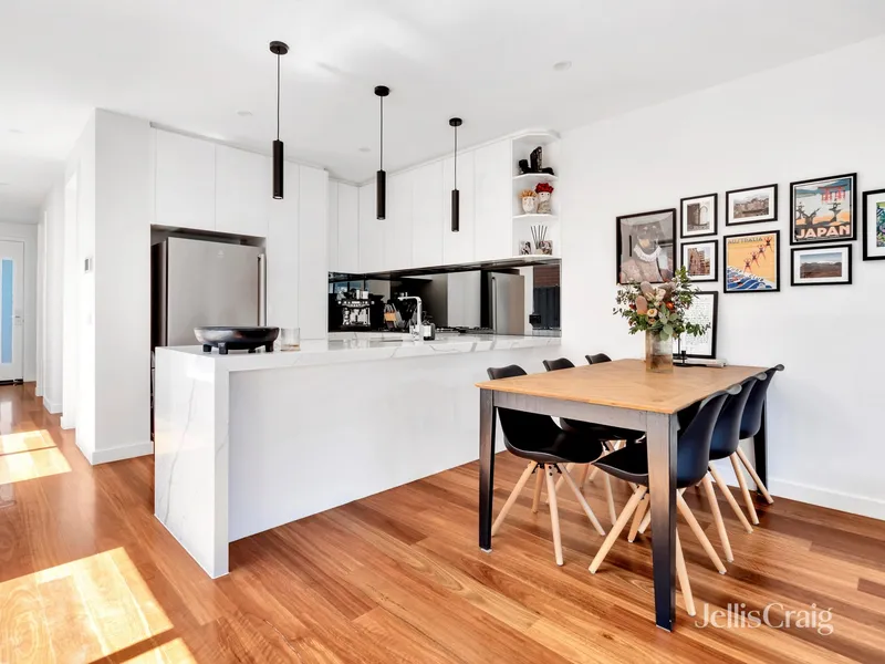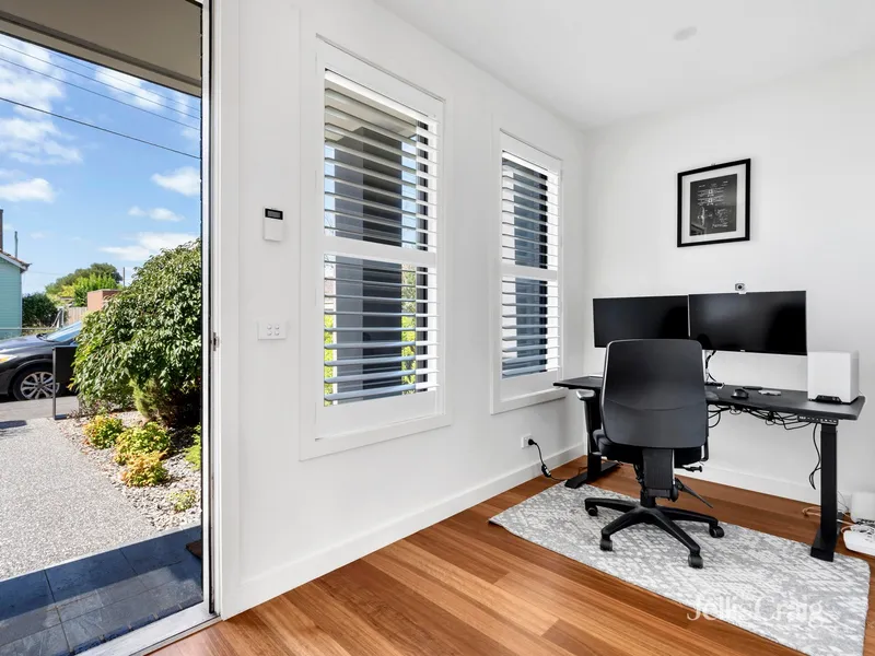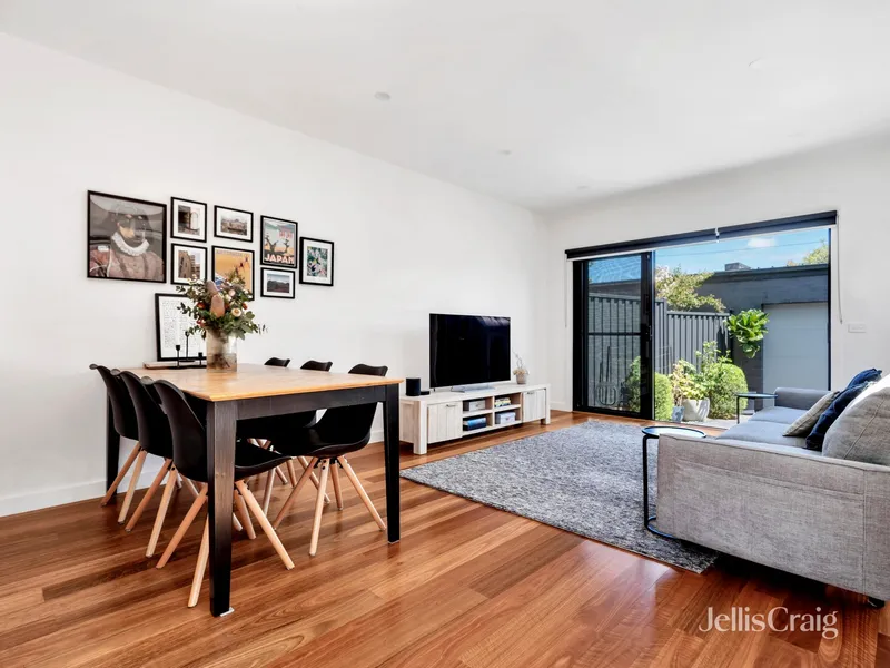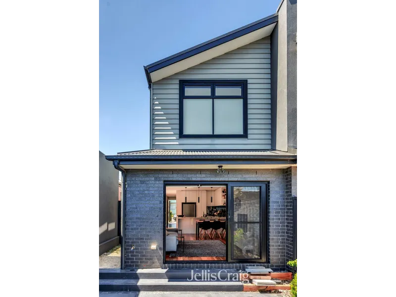 This two-bedroom plus study and two-bathroom residence with street frontage includes a dining and family room, a kitchen with Smeg appliances and stone surfaces, and a courtyard. Two bedrooms with built-in robes, tiled bathrooms, plus ensuite. Further strengths include under-stair storage and a full laundry leading to a powder room. Video intercom, an alarm, heating/air conditioning, shutters, a rainwater tank, and an automatic garage opening to a rear right-of-way. Within 400m of buses, 550m to Brunswick North Primary, Anstey station 1.4 km, and 1 km of Moreland station, Melville Road trams 1.7 km, shops, bars, and restaurants of cosmopolitan Sydney Road (1.2km).