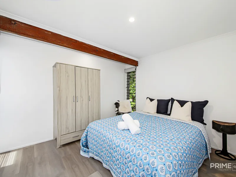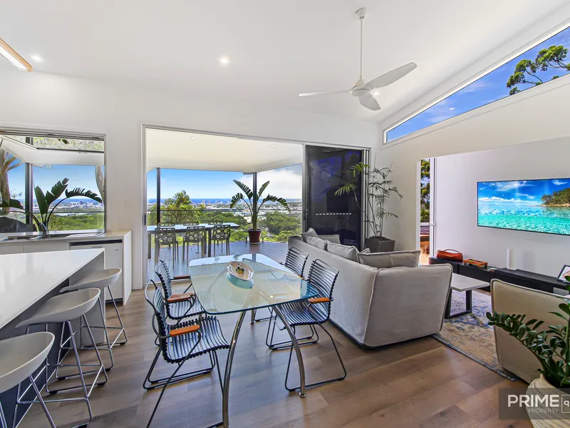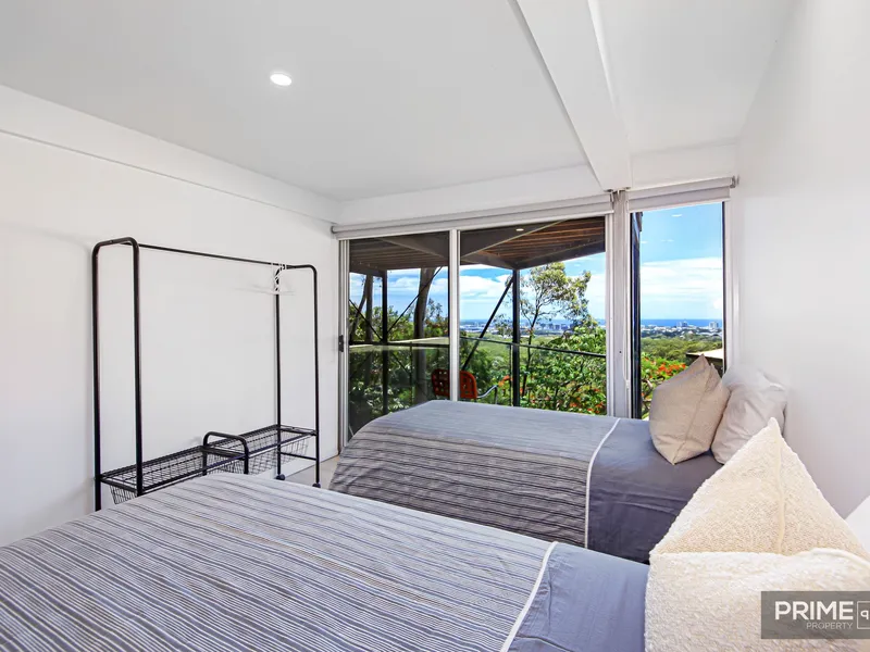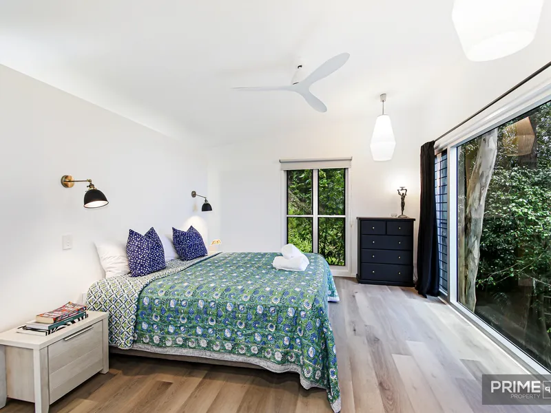 Designed for comfortable living and effortless entertaining, the home features generous open-plan living and dining areas that flow seamlessly to a large north-facing deck. The outlook is a standout, with ocean views extending to Old Woman Island and a lush green canopy creating a private, tranquil atmosphere. Spread across two levels, the layout provides space and flexibility for families, professionals, or those working from home.