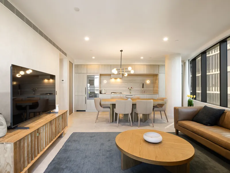 Open-plan living and dining flowing to a private balcony