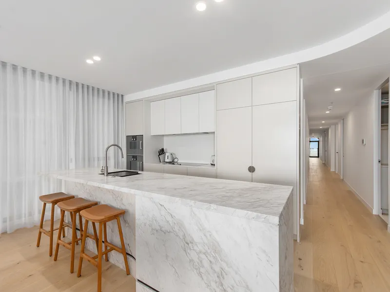 - Floor-to-ceiling glazing facilitates natural light and coastal views throughout the apartment