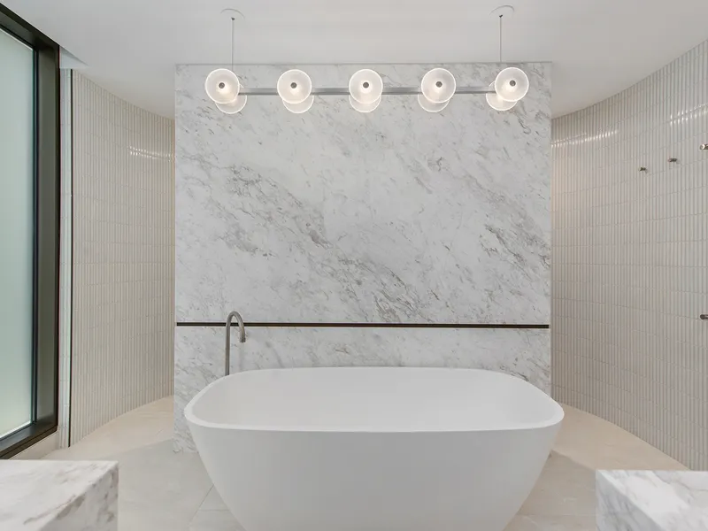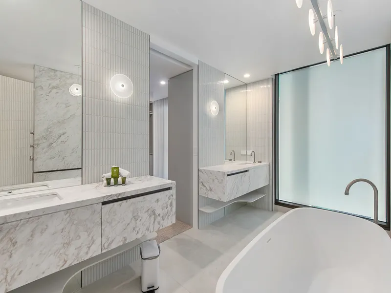 Floor-to-ceiling glazing draws an abundance of natural light into the open living spaces, while extra high ceilings enhance a sense of space throughout. The master ensuite features a free-standing bath, where you can soak away the day's stresses while admiring the sea view.
