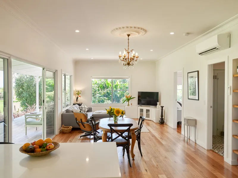 At the heart of the home is the expansive open-plan kitchen, living and dining area. Framed by high ceilings and large bifold doors, the space flows effortlessly to the covered alfresco entertaining area complete with a built-in BBQ and sparkling in-ground pool — ideal for enjoying Byron Bay’s indoor–outdoor lifestyle.