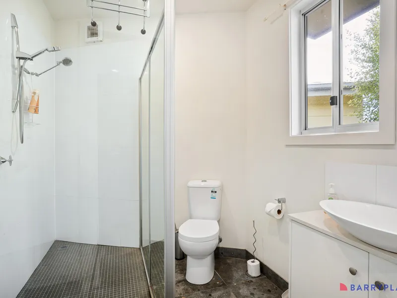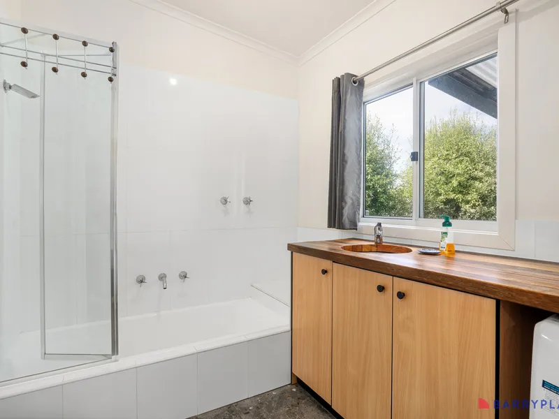 The property features three well-appointed bedrooms. The main bedroom includes a private ensuite with a spacious double shower, while the remaining bedrooms are serviced by a central bathroom. This flexible layout is well suited to families or those needing extra space for a home office or guests.