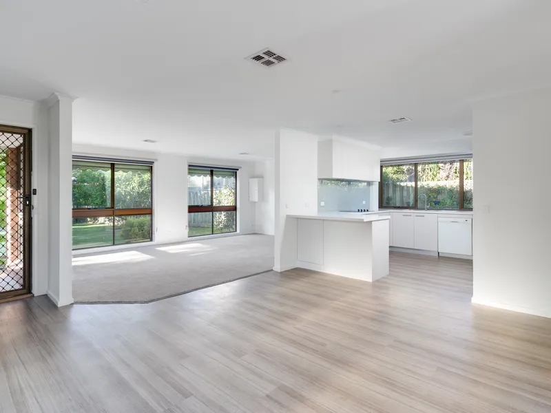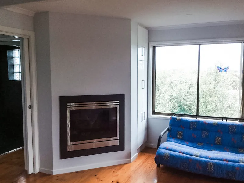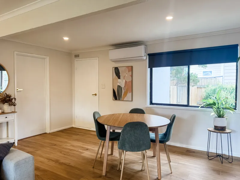 At the heart of the home is a bright open-plan living and dining area, perfect for everyday living and entertaining. A cozy fireplace creates a warm and welcoming atmosphere during the cooler months, while the modern kitchen is equipped with essential appliances to make meal preparation easy.