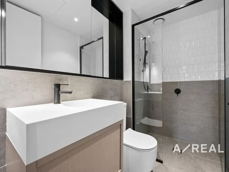 Inside, the apartment offers an open-plan layout featuring spacious living, dining, kitchen, and study areas. A generously sized balcony fills the space with natural sunlight, creating a warm and inviting atmosphere. The kitchen is equipped with stainless steel appliances, including a gas cooktop, oven, and dishwasher. Two well-proportioned bedrooms come complete with built-in robes, while both bathrooms are fitted with a shower, toilet, basin, and mirrored cabinets for added functionality.