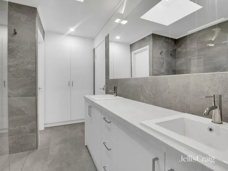 The central bathroom is designed with a frameless glass shower and double sinks, combining practicality with modern appeal.
