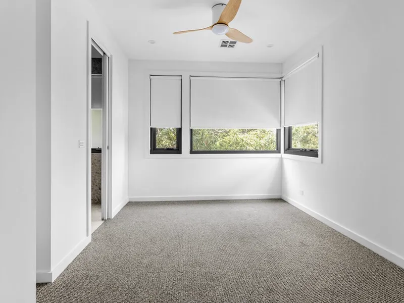 Upstairs, plush wool carpets enhance the comfort of three well-appointed bedrooms. The master bedroom includes a walk-in wardrobe and stylish ensuite, while the second and third bedrooms are fitted with built-in robes. A contemporary central bathroom, complete with a separate bath and double vanity, is ideal for family living.