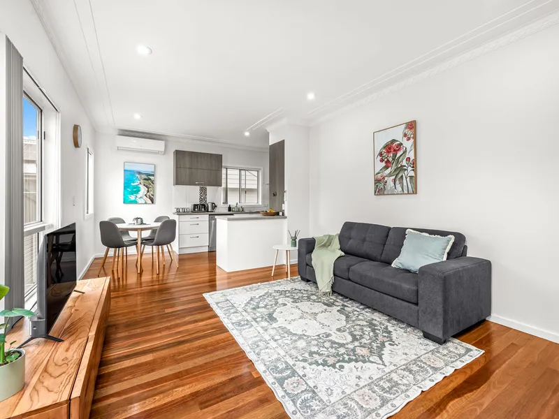 The light-filled open plan living, dining, and kitchen area featuring polished timber flooring and split system air conditioning provides year-round comfort. The modern kitchen is well-equipped with stainless steel appliances and ample storage.
