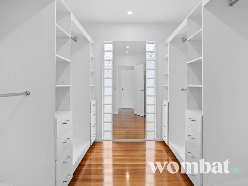 A generous walk-in wardrobe with built-in shelving and drawers provides exceptional storage and organisation.