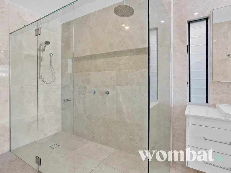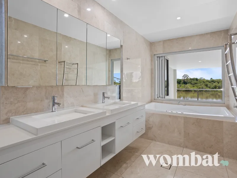 - The master ensuite is appointed with a double vanity, full-sized bath and premium fittings, all complemented by neutral stone finishes.
