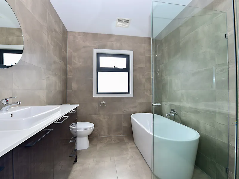 • Fully-tiled bathroom with freestanding bath.