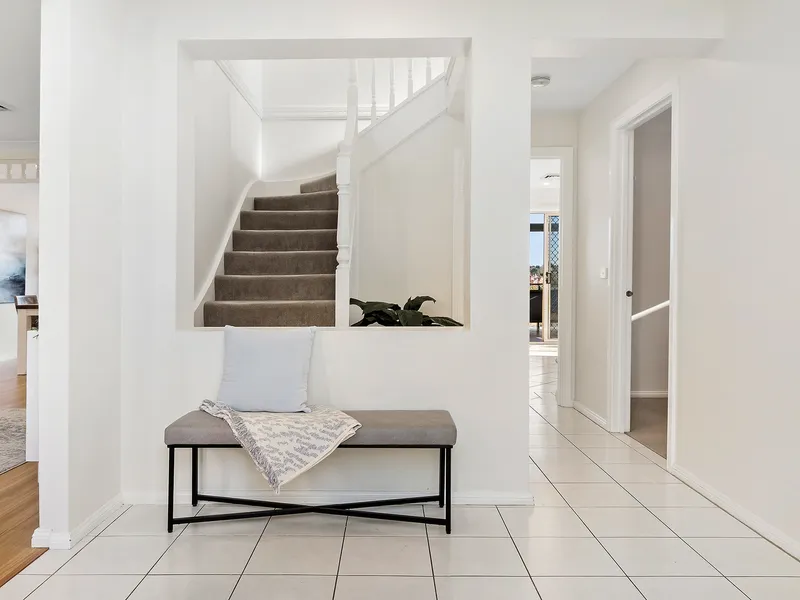 Its grand facade opens up to a stylish entry with arched windows and a soaring double height void. Recently painted, the inviting interior is drenched in natural light with floating floor in the formal lounge and adjoining dining room.