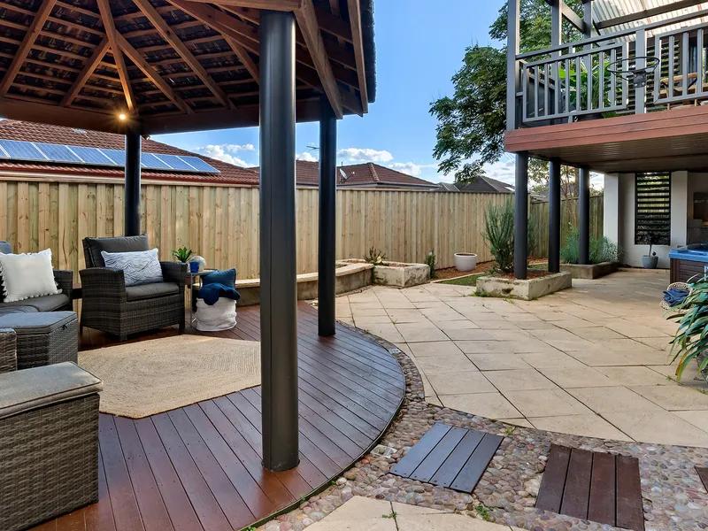 Sliding doors open up to a covered deck overlooking the low maintenance rear garden. A pergola provides another spot for outdoor entertaining.