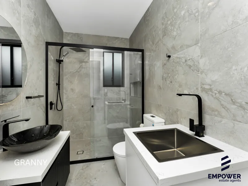 -Designer main bathroom with premium floor-to-ceiling tiling and ceramic vanities