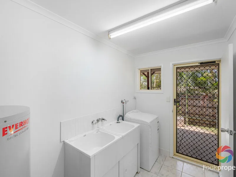 • ?? Tiled laundry with double sink vanity and direct access to the outdoor clothesline.