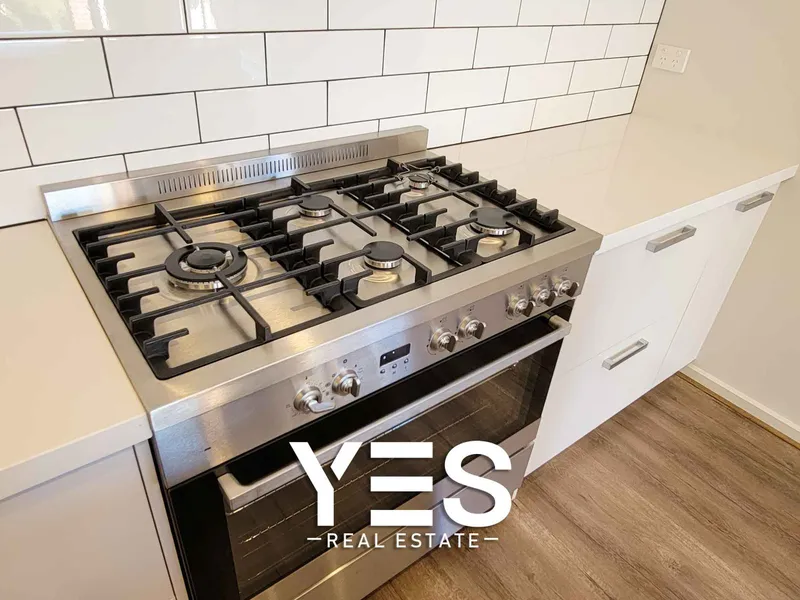 - Modern kitchen with stone benchtops & stainless-steel appliances