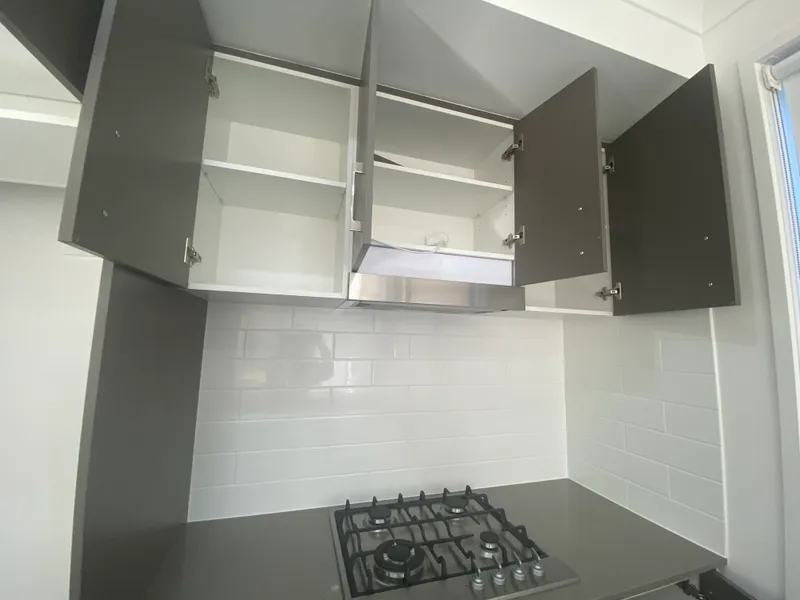 * Stylish kitchen featuring stone bench-top with waterfall edge, stainless steel appliances and tiled splash back.
